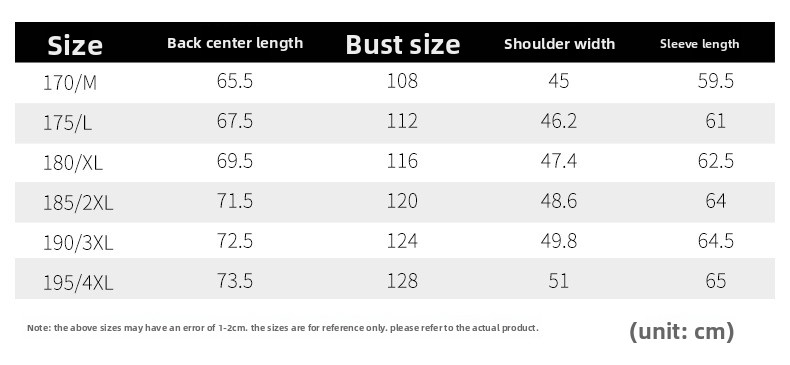 Sizes: 170/M, 175/L, 180/XL, 185/XXL, 190/XXXL, 195/XXXXL