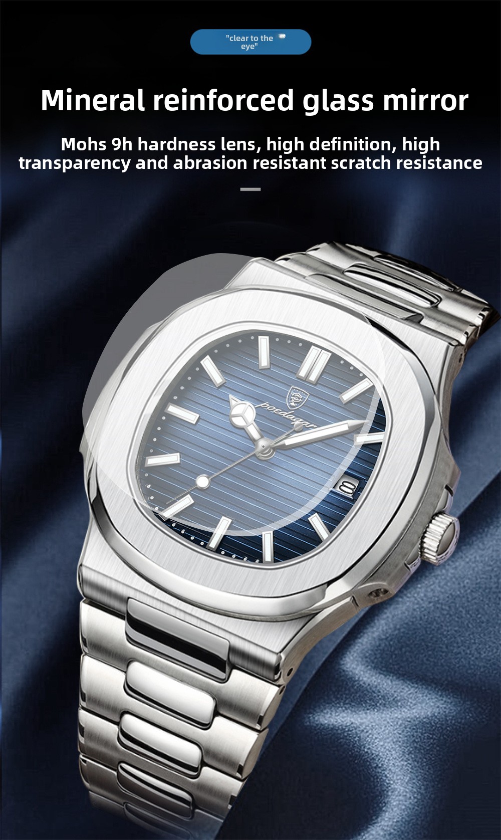 Stylish Design: Square dial with mineral-strengthened glass and stainless steel strap.